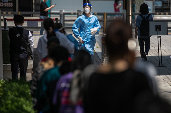 폭염 예보가 나왔던 지난 8일 서울 관악구보건소 선별진료소 앞에서 의료진이 검사를 위해 분주히 움직이고 있다. /사진=뉴스1 |