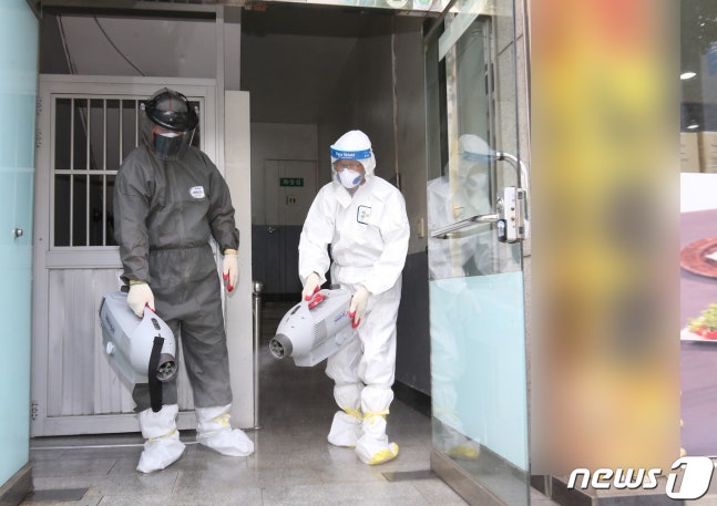 (대전=뉴스1) 김기태 기자 = 신종 코로나바이러스 감염증(코로나19) 확진자가 대전 서구 괴정동 소재 다단계판매업체 제품 설명회장을 방문한 것으로 확인된 가운데 16일 오전 서구 보건소 방역관계자들이 해당 건물을 방역하고 있다. 2020.6.16/뉴스1