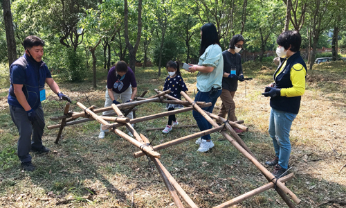 | 지난달 서울 양천구 신월동근린공원에서 ‘꿈의 놀이터’ 활동가들이 어린이들을 위한 나무 구조물을 만들고 있다. 서울시 제공 |