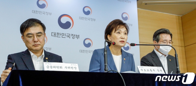 (서울=뉴스1) 안은나 기자 = 김현미 국토교통부 장관이 17일 오전 서울 종로구 정부서울청사에서 주택시장 과열요인 관리방안(6·17대책)을 발표하고 있다. 왼쪽부터 손병두 금융위원회 부위원장, 김 장관, 김용범 기획재정부 1차관. 국토부가 발표한 6·17대책에 따르면 앞으로 투기지구나 투기과열지구 내 3억원이 넘는 아파트를 사면 전세대출 보증이 제한된다. 또 전세대출을 받은 후 해당지구에서 3억원이 넘는 아파트를 구입할 경우엔 대출금도 즉시 회수한다. 최근 집값 상승을 지속하고 있는 경기, 인천, 대전, 청주는 조정대상지역으로 지정한다. 도심 개발사업으로 주택시장 과열 우려가 높은 서울 송파구 잠실동과 강남구 삼성·대치·청담동 4곳은 오는 23일부터 토지거래허가구역으로 지정한다. 2020.6.17/뉴스1