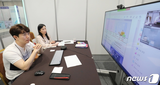 (서울=뉴스1) 김진환 기자 = 17일 오후 서울 강남구 코엑스에서 열린 '신남방 바이어 초청 온라인 화상 수출상담회'에서 국내기업 관계자들이 해외바이어들과 화상 상담을 하고 있다. 2020.6.17/뉴스