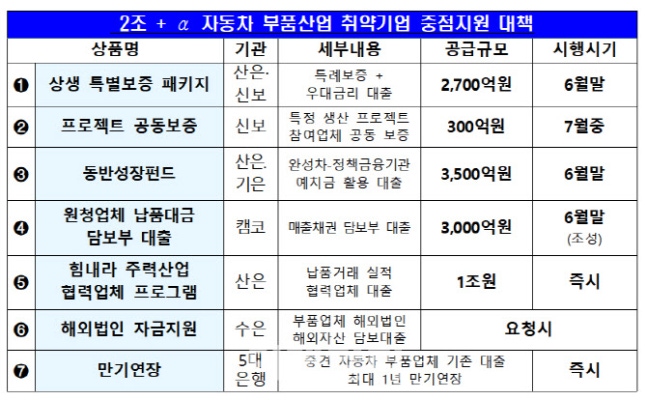 19일 금융위원회는 자동차 부품업체들을 위해 2조원대 규모의 6개의 대출·보증 프로그램과 만기연장 지원 확대를 마련했다고 밝혔다.