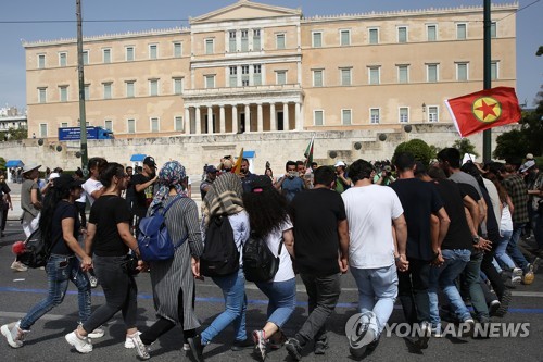 Asylum seekers from Kurdishtan dance as they demonstrate during World Day for Refugees, in Athens, Greece, 20 June 2020. The demonstrators protested against deportations and the Greek government's decision that they should leave their accomodation; houses rented by NGOs or camps. EPA/ORESTIS PANAGIOTOU