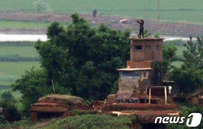(파주=뉴스1) 이동해 기자 = 6·25전쟁 70주년을 맞은 25일 경기 파주 오두산 통일전망대에서 바라본 북한 황해북도 개풍군의 북한군 초소에서 북한군이 체조를 하고 있다 2020.6.25/뉴스1