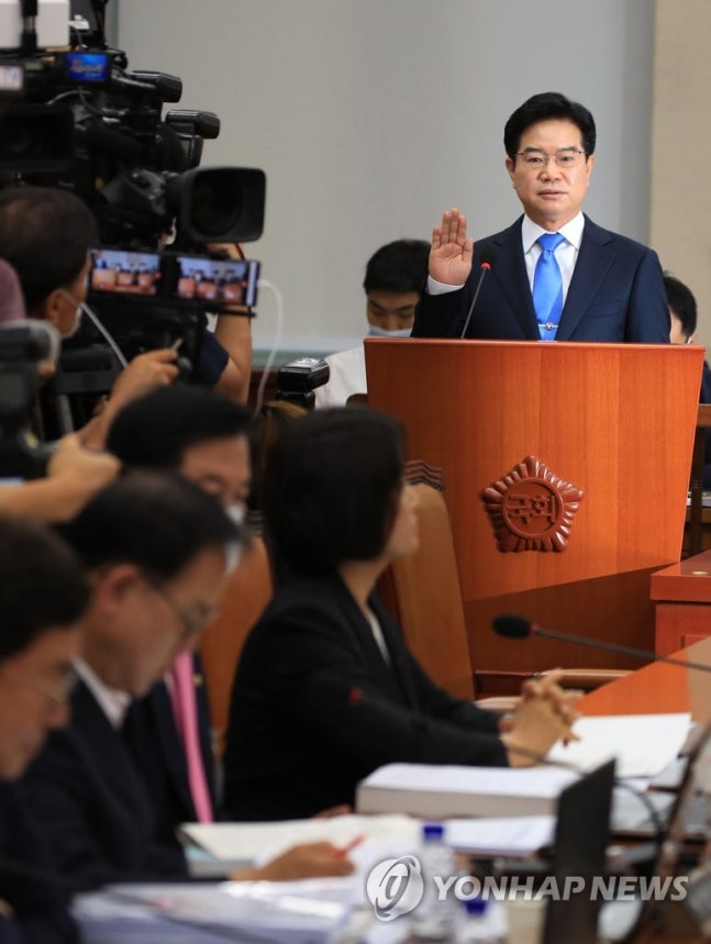 (서울=연합뉴스) 한종찬 기자 = 김창룡 경찰청장 후보자가 20일 오전 서울 여의도 국회에서 열린 인사청문회에서 선서하고 있다. 2020.7.20