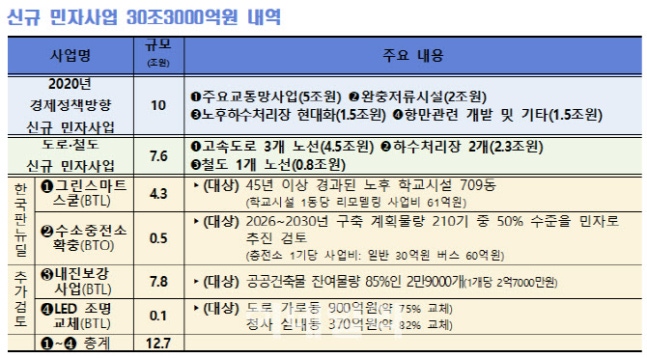 정부는 한국판 뉴딜에 포함된 그린스마트스쿨 사업(4조3000억원), 내진보강 사업(7조8000억원), 수소충전소(5000억조원) 등 12조원 이상 규모로 새로운 유형의 신규 민자사업도 적극 발굴하기로 했다.