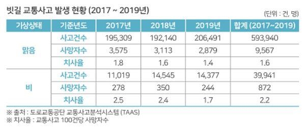 이중 우천 시 교통사고 치사율(사고 100건당 사망자 수)은 약 2.2명으로, 맑은 날(1.6명)보다 사망사고 위험이 37.5% 높게 나타났다.