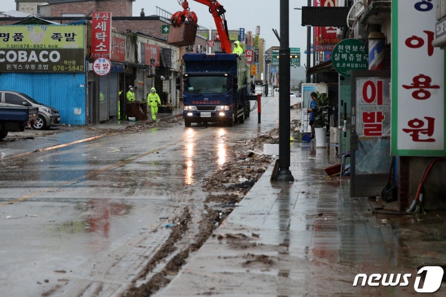 중부지방에 많은 비가 내린 3일 오후 경기도 안성시 죽산시외버스터미널 인근 거리에서 안성시 관계자들이 밀려온 토사에 못쓰게 된 생활용품을 정리하고 있다. 2020.8.3/뉴스1 © News1 조태형 기자