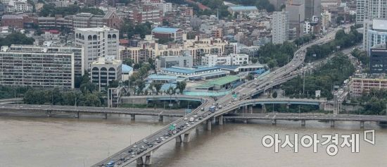 연이은 폭우로 한강수위가 상승하고 있는 6일 서울 여의도 63스퀘어 전망대에서 바라본 강변북로 일부구간이 차량운행통제되고 있다./강진형 기자aymsdream@