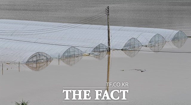 [더팩트ㅣ파주=이덕인 기자] 전국적으로 많은 비가 내리고 있는 6일 오전 경기 파주시 적성면 일대에서 폭우로 인해 비닐하우스가 침수돼 있다.