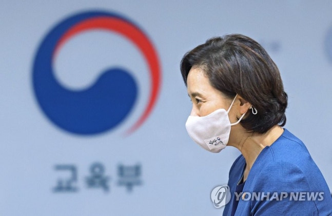 (세종=연합뉴스) 김도훈 기자 = 유은혜 사회부총리 겸 교육부 장관이 6일 오후 정부세종청사에서 열린 '제8차 포스트 코로나 교육 대전환을 위한 대화'에 참석해 자리로 향하고 있다. 2020.8.6