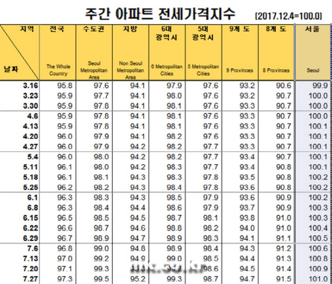 서울 전세가격지수, 20주째 100 상회…지난주 이미 101선도 넘어
