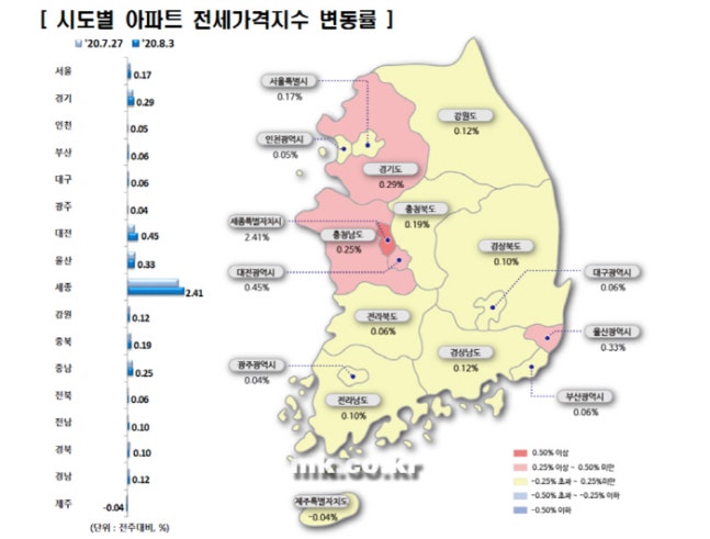 시도별로는 세종(2.41%), 대전(0.45%), 울산(0.33%), 경기(0.29%), 충남(0.25%), 충북(0.19%), 서울(0.17%), 강원(0.12%), 경남(0.12%), 전남(0.10%) 등은 상승했고 유일하게 제주(-0.04%)만 하락했다.