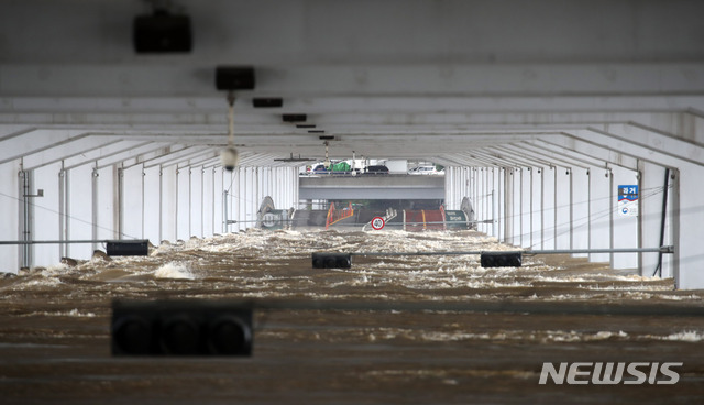 [서울=뉴시스] 고범준 기자 = 집중호우로 팔당댐과 소양강댐 방류량이 늘면서 한강의 수위가 높아지고 있는 6일 오후 서울 잠수교가 닷새째 전면 통제되고 있다. 2020.08.06.