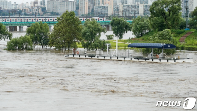 (서울=뉴스1) 안은나 기자 = 집중호우로 한강수위가 높아진 6일 서울 노들섬 선착장이 물에 잠겨 있다. 2020.8.6/뉴스1
