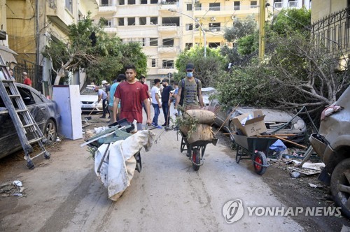 Lebanese people take part in a campaign to clean streets at the Ashrafieh area in Beirut, Lebanon, 06 August 2020. According to the Lebanese Health Ministry at least 137 people were killed, and more than 5,000 injured in the blast believed to have been caused by an estimated 2,750 of ammonium nitrate stored in a warehouse. The explosion and its shockwave on 04 August 2020 devastated the port area and parts of the city. EPA/WAEL HAMZEH