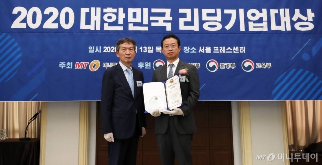 2020 대한민국 리딩기업대상 / 사진=김휘선 기자 hwijpg@구보성 엠비디 대표(사진 오른쪽)가 13일 오후 서울 중구 한국프레스센터에서 열린 머니투데이 주최의 '2020 제6회 대한민국 리딩기업대상' 시상식에서 '신약개발' 부문 '바이오대상 2년 연속상'을 수상하고 정희경 머니투데이 전무와 기념 촬영 중이다.