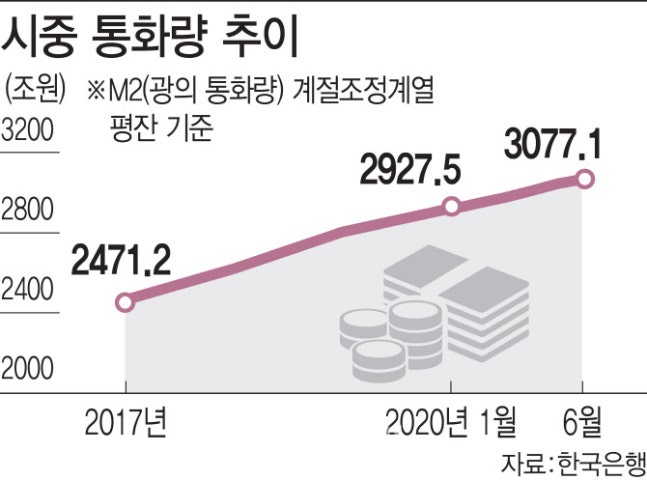 13일 한국은행이 발표한 ‘2020년 6월중 통화 및 유동성’에 따르면 6월 광의의 통화량(M2)은 3077조원776억원(계절조정계열·평잔)으로 전월보다 23조2000억원(0.8%) 증가했다.
