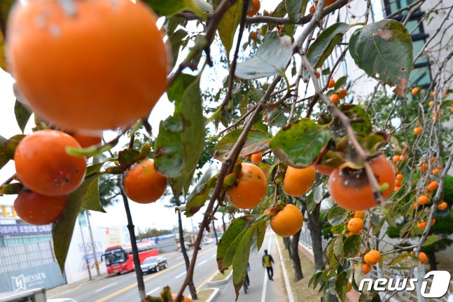 (포항=뉴스1) 최창호 기자 = 12일 오전 경북 포항시 북구 항구동 포항지방해양수산청에 심어진 감나무 가로수 아래로 시민들이 출근하고 있다. 2020.10.12/뉴스1