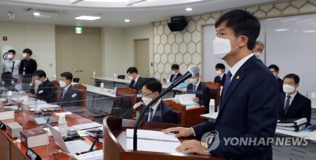 (세종=연합뉴스) 김주형 기자 = 김대지 국세청장이 12일 오전 세종시 정부세종2청사에서 열린 국회 기획재정위원회의 국세청에 대한 국정감사에서 업무보고를 하고 있다. 2020.10.12