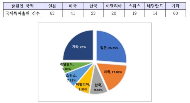 최근 5년간 국제 특허출원 중 한국인에 의한 국제출원 비율(9.58%)은 일본(26.25%), 미국(17.08%)에 이어 3위였다.
