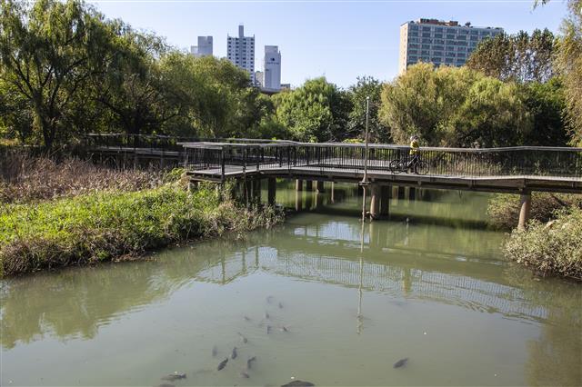 여의도 벚꽃놀이로 유명한 윤중로를 건너 서울미래유산인 윤중제 아래로 내려서면 6㎞에 걸쳐 펼쳐지는 여의도 샛강생태공원이 나타난다. 토종잉어가 떼 지어 다니는 서울의 비경을 형성하고 있다. 윤중로를 건너 윤중제 아래로 내려서면 샛강생태공원이다. 샛강공원의 길이는 6㎞ 남짓이라고 한다. 1997년 조성 당시 사진을 보면 인공 공원의 모습이 뚜렷했는데 이제는 버드나무가 우거지고 갈대가 무성한 자연습지의 모습을 상당 부분 회복하고 있다. 샛강공원에 사는 생물들의 바이오리듬을 깨지 않으려 밤에도 불을 켜지 않는다고 한다. 놓아 기르는 비단잉어가 아닌 야생의 누런 토종잉어가 떼 지어 헤엄치는 모습을 보는 재미도 쏠쏠하다.한 지도사의 어린 시절 샛강은 겨울이면 스케이트장이 됐다고 한다. 하긴 필자도 그 시절 경복궁 경회루며 창경궁 춘당지로 스케이트를 타러 다녔던 기억이 있다. 동대문디자인플라자 자리에 있던 서울운동장 야구장도 겨울이면 바닥에 물을 가둬 스케이트장을 만들었다. 경회루에서 스케이트를 타며 어묵이며 떡볶이를 사 먹었으니 호랑이 담배 먹던 시절이다.