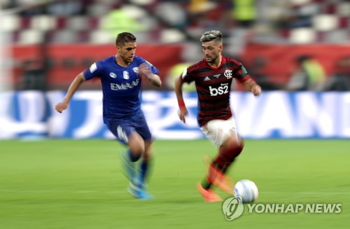 Giorgian De Arrascaeta (R) of Flamengo in action against Gustavo Cuellar of Al Hilal SFC during the FIFA Club World Cup semi final soccer match between CR Flamengo and Al Hilal FC in Doha, Qatar, 17 December 2019. EPA/ALI HAIDER