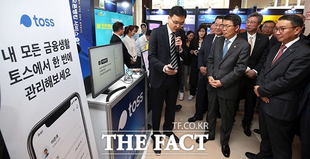 은성수 금융위원장과 김학수 금융결제원장을 비롯한 금융 관계자들이 18일 오전 서울 중구 웨스틴조선호텔에서 열린 '오픈뱅킹 서비스 출범식'에 참석해 토스의 오픈뱅킹 활용 서비스를 살펴보고 있다. /이동률 기자◆'新 금융' 오픈뱅킹 출범…핀테크 기업, 달라진 게 없다?