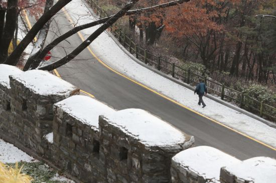 동짓날인 22일 오전 서울 남산 산책길에 쌓인 눈 위로 한 시민이 걷고 있다. 기상청에 따르면 중부지방은 밤에 북서쪽부터 차차 흐려져 경기 북부와 강원 영서 북부는 늦은 밤에 비 또는 눈이 내리겠다. / 사진=연합뉴스
