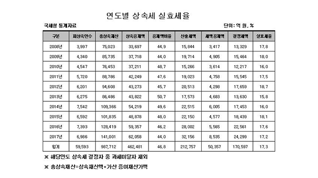 상속세의 명목 최고세율은 50%이지만 평균 실효세율은 17.3%인 셈입니다.