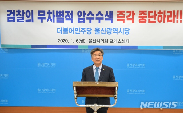 [울산=뉴시스] 배병수 기자 = 백운찬 더불어민주당 울산시당 수석대변인은 6일 오후 울산시의회 프레스센터에서 기자회견을 열고 검찰의 무차별적 압수수색 즉각 중단 할 것을 촉구하고 있다. 2020.01.06. [email protected][울산=뉴시스]박수지 기자 = 더불어민주당 울산광역시당은 6일 울산시의회 프레스센터에서 기자회견을 열고 "검찰은 무차별적인 소환과 압수수색으로 울산시 행정을 마비시켜놓는 형태를 즉각 중단할 것"을 촉구했다.