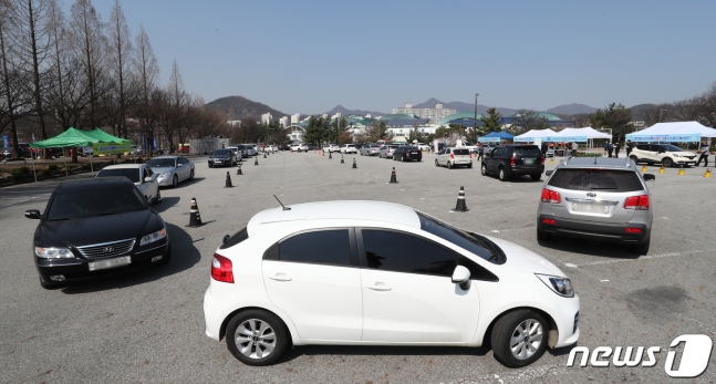 (대전=뉴스1) 김기태 기자 = 제75회 식목일을 앞두고 3일 오전 대전 유성구 월드컵경기장 주차장에서 열린 드라이브 스루형 내 나무 갖기 캠페인에서 시민들이 묘목과 공기정화식물을 받기 위해 기다리고 있다. 2020.4.3/뉴스1