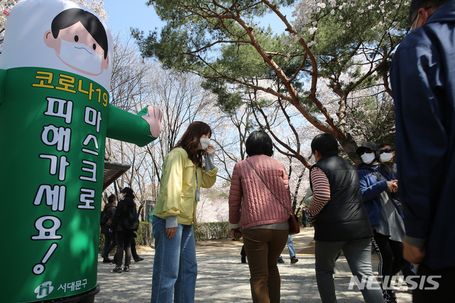 [서울=뉴시스]박주성 기자 = 서대문구청 직원들이 주말인 4일 안산(鞍山) 연희숲속쉼터 부근에서 산책 나온 시민들에게 마스크 착용과 사회적 거리두기를 안내하고 있다. 이날 서대문구가 마스크 착용을 강조하기 위해 세운 이색 설치물이 눈길을 모았다. (사진=서대문구 제공). 2020.04.05.