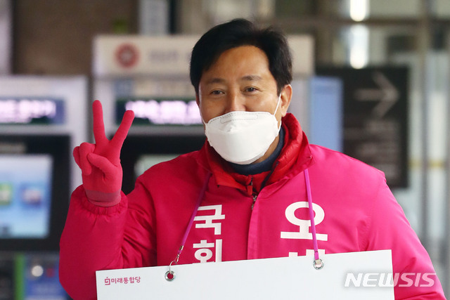 [서울=뉴시스]홍효식 기자 = 오세훈 미래통합당 광진구을 후보가 8일 오전 서울 광진구 건대입구역 역사내에서 출근길 시민들에게 유세를 하고 있다. 2020.04.08.