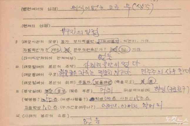 연세대학교 4월혁명연구반이 조사한 '3.15 의거' 당시 마산 성지여고 1학년 김정희(15) 학생의 부상자실태조사서(사진=문화재청제공) #1."허울좋은 자유는 필요치 않다. 민주주의 사수한다"1960년 4·19 혁명의 기폭제였던 '3·15 의거' 당시 마산 성지여고 1학년 김정희(15) 학생은 북마산파출소 앞에서 경찰이 쏜 총탄에 맞아 두개골 관통상을 입고 9일동안 의식불명상태였다.