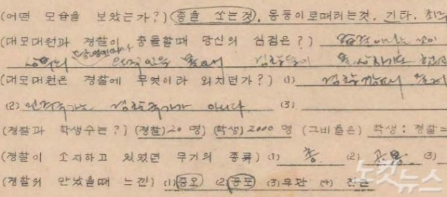 연세대학교 4월혁명연구반이 조사한 '3.15 의거' 당시 마산 성지여고 1학년 김정희(15) 학생의 부상자실태조사서(사진=문화재청제공) #1."허울좋은 자유는 필요치 않다. 민주주의 사수한다"