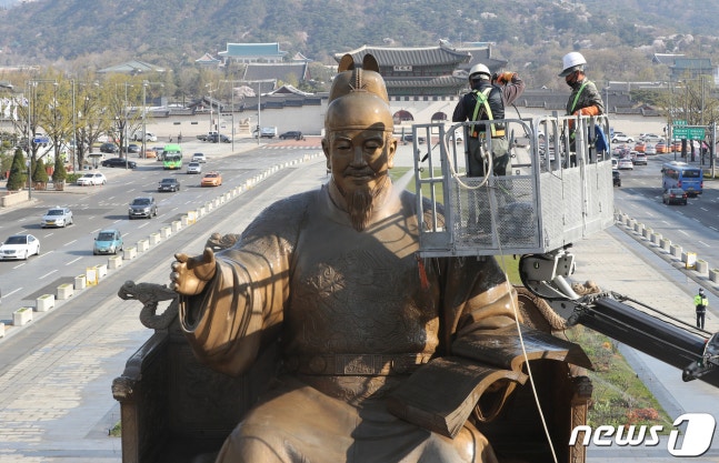 (서울=뉴스1) 유승관 기자 = 9일 서울 광화문광장 세종대왕 동상에서 서울시 관계자들이 동상 물청소 및 이물질 제거작업을 하고 있다. 2020.4.9/뉴스1