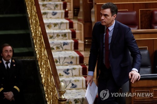 Spanish Prime Minister Pedro Sanchez (R) on his way to deliver a speech during the plenary session at Lower Chamber of Spanish Parliament, in Madrid, Spain, 09 April 2020. The session is to be focused on passing a new extension of the state of alarm due to coronavirus outbreak. EPA/Mariscal / POOL