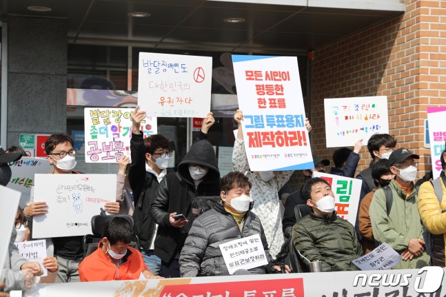 (서울=뉴스1) 유새슬 기자 = 장애인차별금지추진연대를 비롯한 장애인 단체 회원들이 10일 서울 종로구 청운효자동 사전투표소 앞에서 기자회견을 열고 장애인 참정권 보장을 촉구하고 있다. 2020.4.10/뉴스1