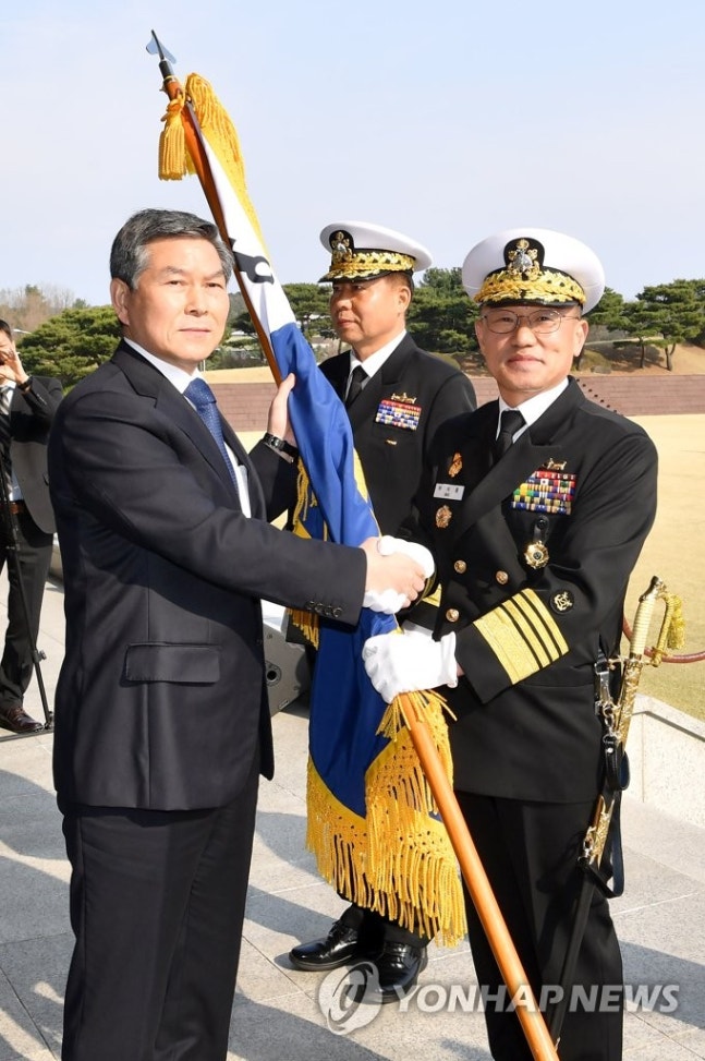(서울=연합뉴스) 10일 충남 계룡대에서 열린 제33·34대 해군참모총장 이취임식에서 정경두 국방부 장관(왼쪽)이 부석종 신임 해군참모총장에게 해군기를 이양하고 있다. 2020.4.10