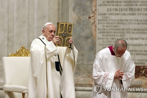 Pope Francis (L) leads the Easter Vigil Mass in St. Peter's Basilica, behind closed door due to the outbreak of the coronavirus disease (COVID-19) at the Vatican, 11 April 2020. EPA/REMO CASILLI / POOL