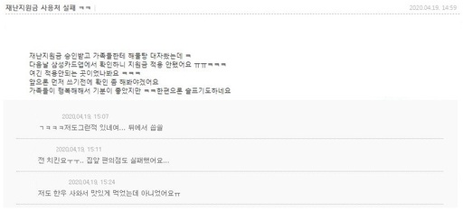 지원금을 수령한 뒤 사용 가능한 매장인 줄 알고 결제했으나, 알고 보니 사용 불가능한 매장이어서 개인 카드 한도에서 금액이 결제됐다는 게 주된 내용이다.