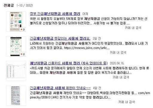 | 긴급재난지원금 사용처를 정리해서 공유하는 누리꾼들. 사진=네이버 까페 글 목록 검색 페이지 캡처 |