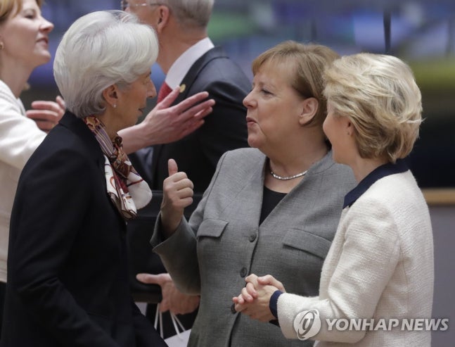 지난해 EU 정상회의 자리서 만난 라가르드(왼쪽부터) ECB 총재와 메르켈 독일 총리, 폰데어라이엔 EU 집행위원장 [EPA=연합뉴스](베를린=연합뉴스) 이광빈 특파원 = 앙겔라 메르켈 독일 총리는 유럽중앙은행(ECB)의 양적완화 정책을 일부 위헌으로 판단한 독일 헌법재판소의 판결에 대해 우려하면서도 해결에 낙관적인 모습을 보였다.