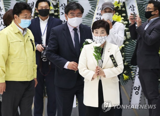 (이천=연합뉴스) 홍기원 기자 = 더불어민주당 노동현장 대형 안전사고 방지 대책 특별위원회 전혜숙 위원장이 12일 오전 경기도 이천시 서희청소년문화센터에 마련된 이천 물류창고 공사장 화재 합동분향소에서 헌화하고 있다. 2020.5.12