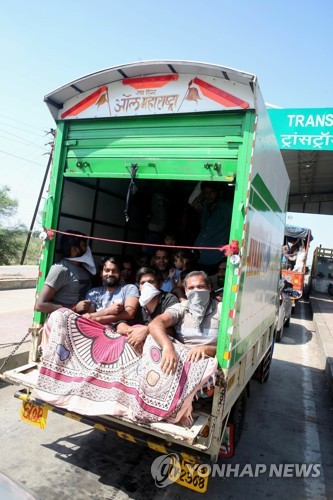 Migrant worker travel on a truck on a connecting road to the highway to return to their villages near Bhopal, Madhya Pradesh, India, 12 May 2020. Thousands of migrants workers are returning to their villages after the Indian government announced a lockdown extension for two weeks untill 17 May, imposing a new relaxation action plan for Red, Orange and Green Zones to stem the widespread of the SARS-CoV-2 coronavirus. EPA/SANJEEV GUPTA