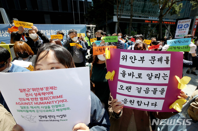 [서울=뉴시스]김병문 기자 = 정의기억연대 전 이사장인 윤미향 더불어시민당 당선인에 대한 수요시위 기부금과 한일 위안부 합의 관련 논란이 불거진 가운데 13일 오후 서울 종로구 중학동 옛 주한일본대사관 앞 평화의 소녀상에서 열린 1439차 일본군 위안부 문제 해결을 위한 정기 수요시위 참석자들이 손피켓을 들고 있다. 2020.05.13.
