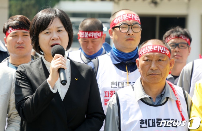 (울산=뉴스1) 조민주 기자 = 이정미 정의당 대표가 24일 울산 동구 현대중공업에서 물적분할 반대 기자회견을 하고 있다. 2019.5.24/뉴스1