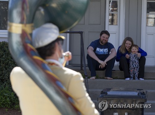 Residents listen from their stoop, as Musician Zach Hickman plays his sousaphone on the streets of Watertown, Massachusetts, USA 13 May 2020. Hickman, a professional bass player, has had over 125 music gigs cancelled and is now spending his afternoons playing for the residents of Watertown. Countries around the world have closed borders, schools as well as public facilities, and have cancelled most major sports and entertainment events in order to prevent the spread of the SARS-CoV-2 coronavirus causing the Covid-19 disease. EPA/CJ GUNTHER