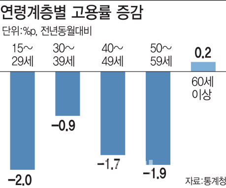 세부 지표를 살펴보면 취약계층의 피해가 두드러졌다. 먼저 세대별로는 청년층 피해가 컸다. 지난달 청년층(15~29세) 고용률은 2.0%포인트 감소한 40.9%를 기록했다.